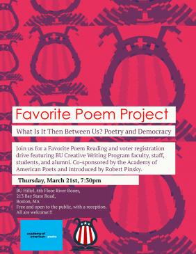 The Favorite Poem Project in Boston, Massachusetts, will present a reading of favorite poems by faculty, students, staff, and alumni of the Boston University Creative Writing Program in March. It will also share voter registration information during this event, as well as for the rest of the month at its office, as a way of encouraging the voice—both of poetry and democracy—in the spirit of the Favorite Poem Project.