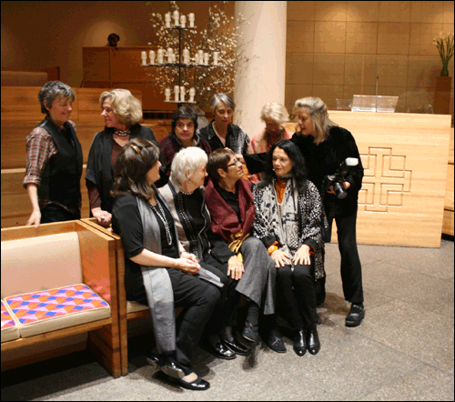 (Left to right, back row) Eileen Myles, Erica Jong, Fran Winant, Joan Larkin, and Jean Valentine; (left to right, front row) Honor Moore, Susan Griffin, Toi Derricotte, and Anne Waldman, being posed by photographer Star Black at an event focusing on poetry from the women's movement.