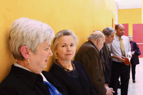 (Left to right) Ellen Bryant Voigt, Susan Stewart, Gerald Stern, Robert Pinsky, Carl Phillips, and Marilyn Hacker before the reading at the Times Center that kicked off the 2009 Poets Forum in New York City.