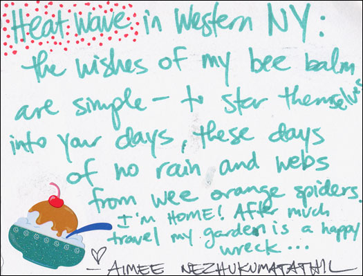 "Heatwave in Western NY. The wishes of my bee balm are simple—to star themselves into your days, these days of no rain and webs from wee orange spiders. I'm home! After much travel my garden is a happy wreck..."