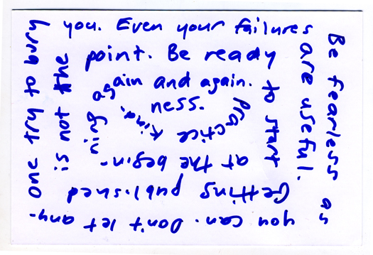 Be fearless as you can. Don't let anyone try to bury you. Even your failures are useful. Getting published is not the point. Be ready again and again. Practice kindness.